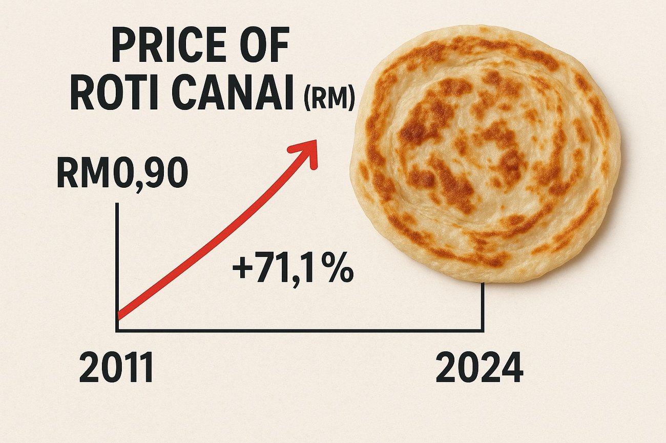 If you didn't know, over the past 13 years, the price of roti canai, once the symbol of an affordable Malaysian breakfast, has risen sharply from about RM0.90 (2011) to RM1.54 (2024), a rise of 71.1%, according to the Department of Statistics Malaysia’s Analysis of Annual CPI 2024, as reported by The Star.